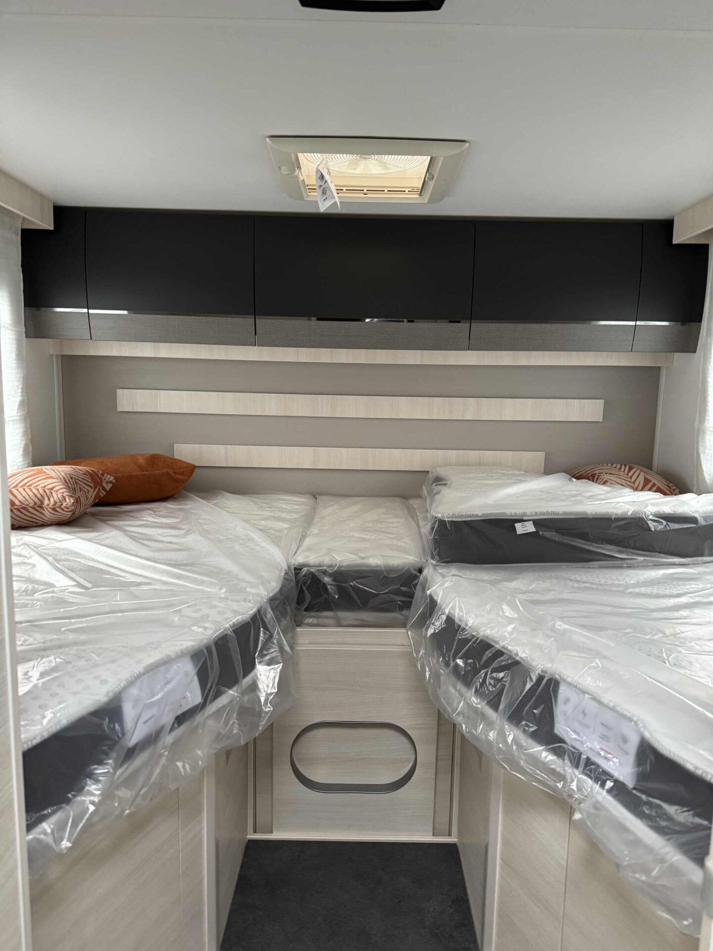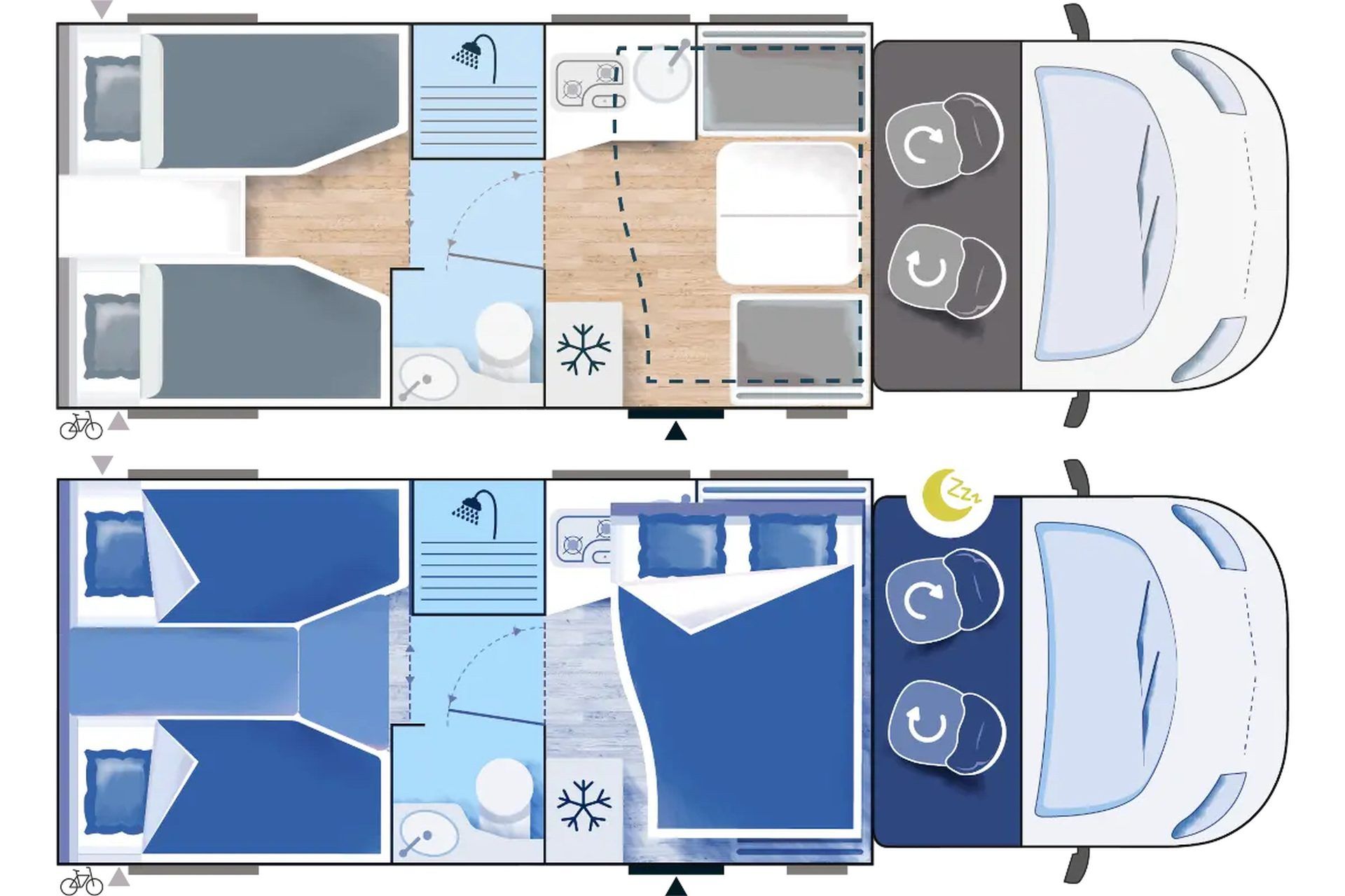 Mit seinen knapp 7,20 m Länge wird der 777GA modernsten Ansprüchen gerecht: 90 cm breite Einzelbetten + Erweiterung zum King-Size-Bett, Garage, „Smartlounge“-Wohnzimmer mit gegenüber angeordneten Längsbänken, Badezimmer mit zwei Trennwänden… hier fehlt es an nichts!