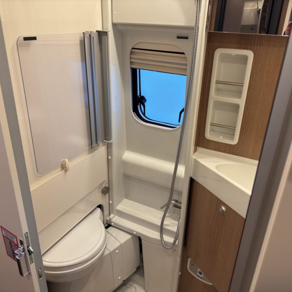 - Komfortabler Nassraum mit Dusche, Toilette und klappbarem Waschbecken
