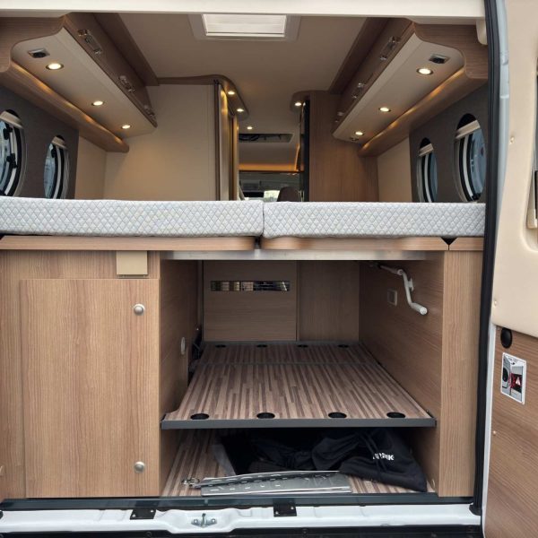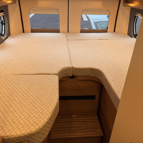 - Betten: Längsbetten im Heck, die zu einem großen Doppelbett umgebaut werden können