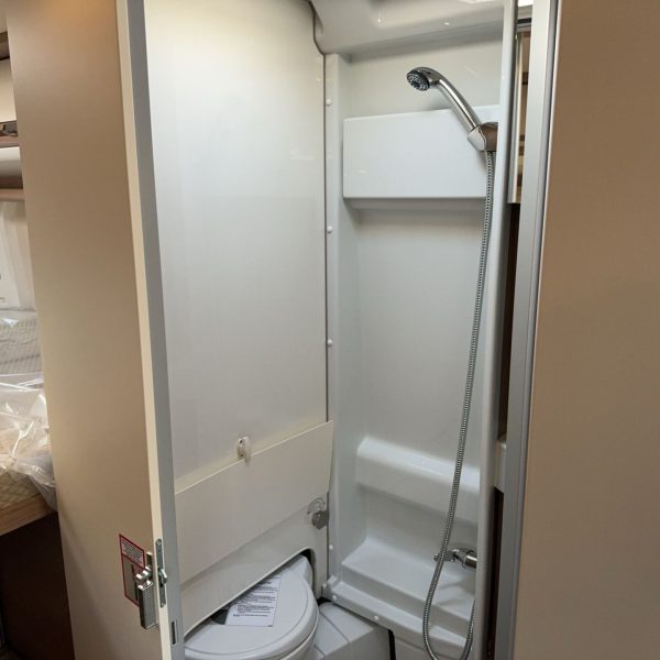 - Badezimmer: Dusche, Toilette und eine clevere klappbare Waschbeckenanordnung.
